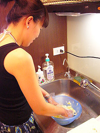 2. 將水壓掉 . 再用清水將鹽水洗去.