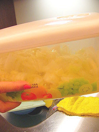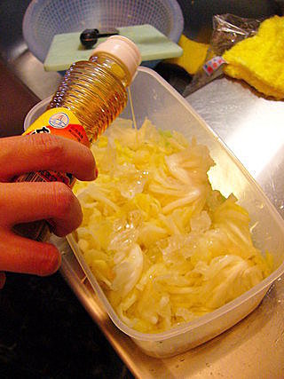 1. 先將菜撕開 . 和鹽抓一抓 . 直到水份釋出 .