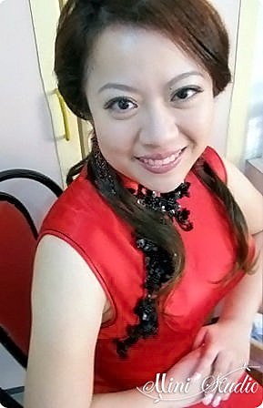 訂婚宴造型是在新娘家完成,正紅色改良式旗袍很古典。