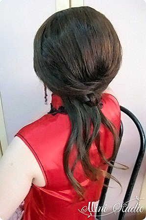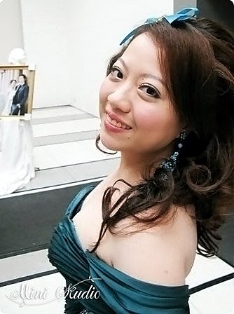 藍綠色的送客禮服,顏色很美,髮型上保留側邊瀏海以修飾臉型,並做出捲度來,與上一款有很大的差異性,如何於有限的時間內將包頭改變成浪漫公主捲髮,考驗著每一位造型師呢!