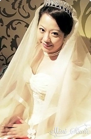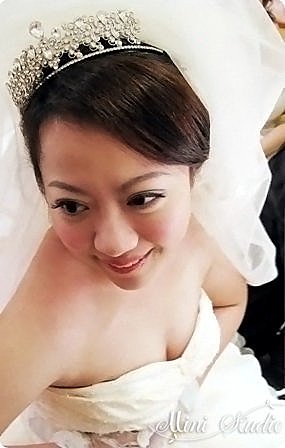 喜宴進場,頭紗重新造型並以微側戴上皇冠,讓整體感覺更為俏麗活潑。