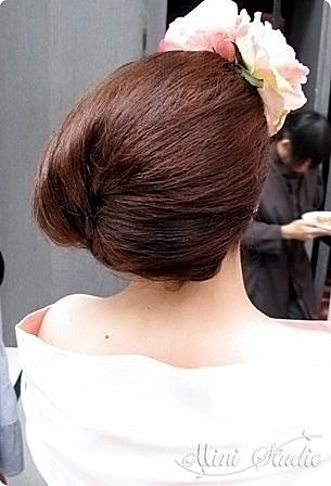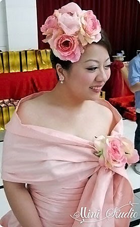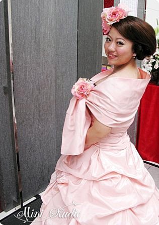 粉紅色公主平口蓬裙敬酒禮服~我將披肩抓出線條後簡單縫過以後,在加上玫瑰花,讓整件禮服更有設計感,並以玫瑰來裝點這款側邊的包頭髮型,再加上小玫瑰耳環,這樣的豐富已經是恰到好處,so我們不再配戴項鍊。